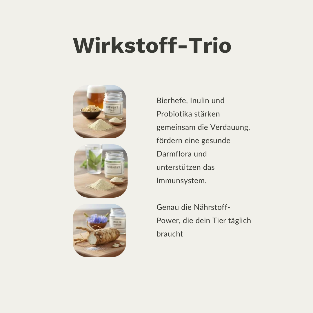 Für positive Effekte: Haut, Fell, Verdauung, Immunsystem, reich an Vitamin B für Nerven, Stoffwechsel und Abwehrkräfte, unterstützt bei Hautproblemen und trockenem Fell